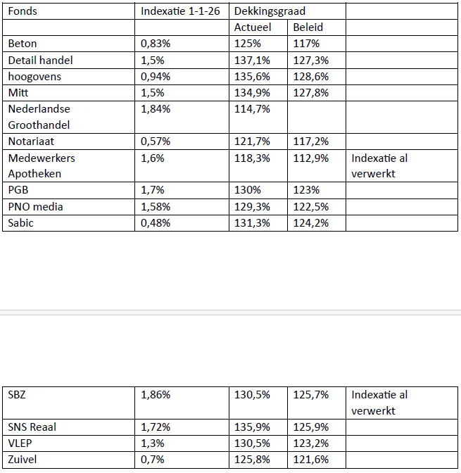 De meeste van deze fondsen hebben een hoge dekkingsgraad. De actuele dekkingsgraad is de dekkingsgraad van november of december 2025. De beleidsdekkingsgraad is het gemiddelde van de voorgaande 12 maanden.